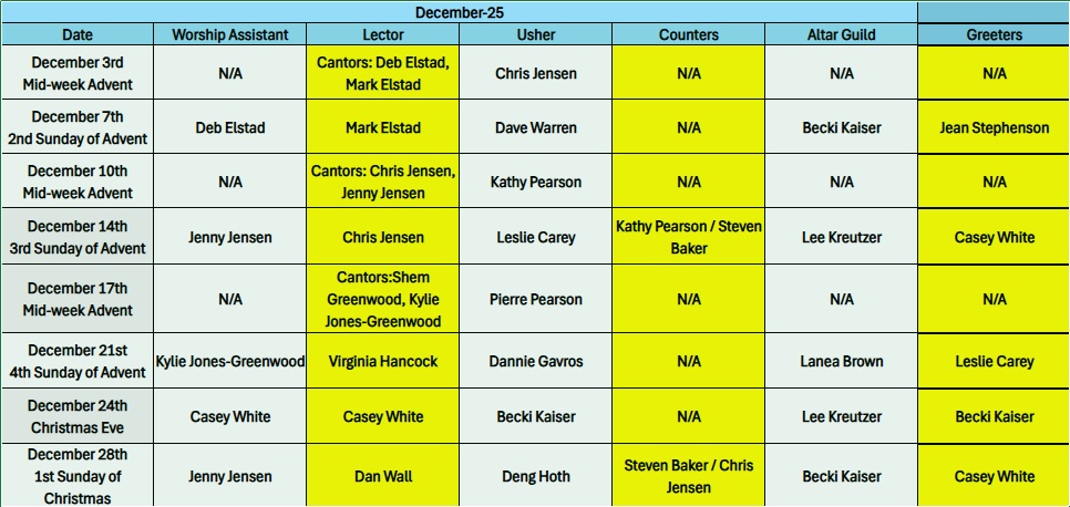 Please remember that it's your responsibility to find a replacement and to let Pastor Christine and Kristin know.