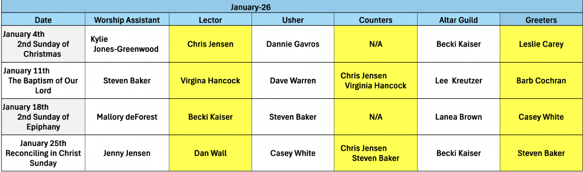 Please remember that it's your responsibility to find a replacement and to let Pastor Christine and Kristin know.