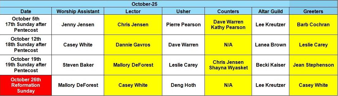 Please remember that it's your responsibility to find a replacement and to let Pastor Christine and Kristin know.